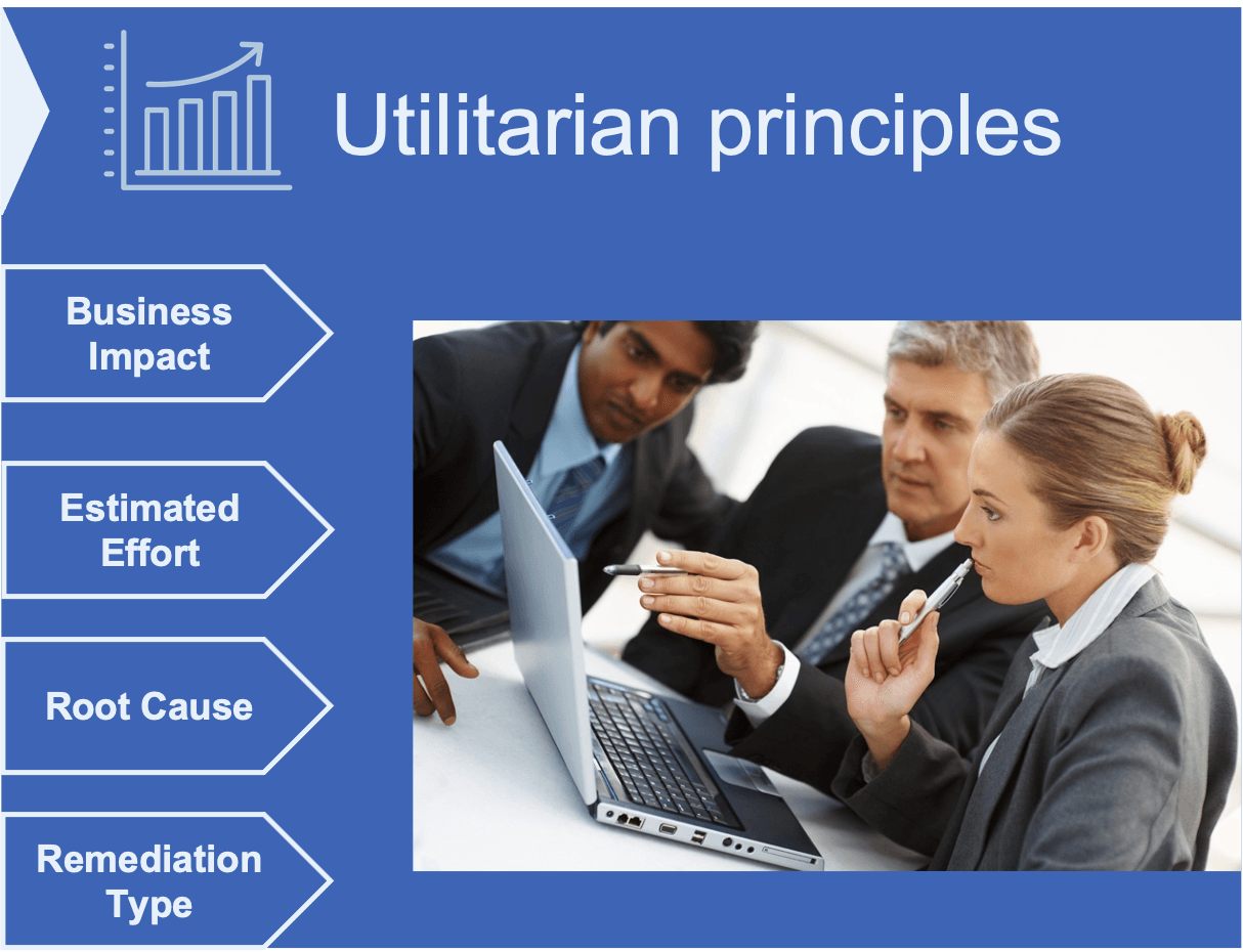 The utilitarian principle is that each data finding becomes weighted with an economic value. Such data sanity becomes turned into findings with an economic measure (time, count, $). I call this process the utilitarianization of integrity. Some authors call this process incremental validation of data. Whatever it is called, it gives data (findings) finally a shape, a form, a face, a Gestalt.