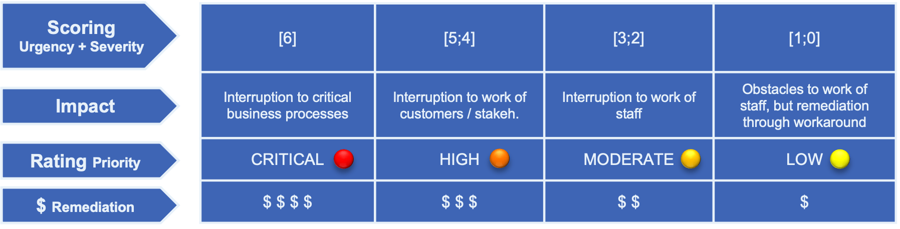 Unfortunately, today it is not standard to decorate findings with economic measures. Beyond, this is not managed by rules.