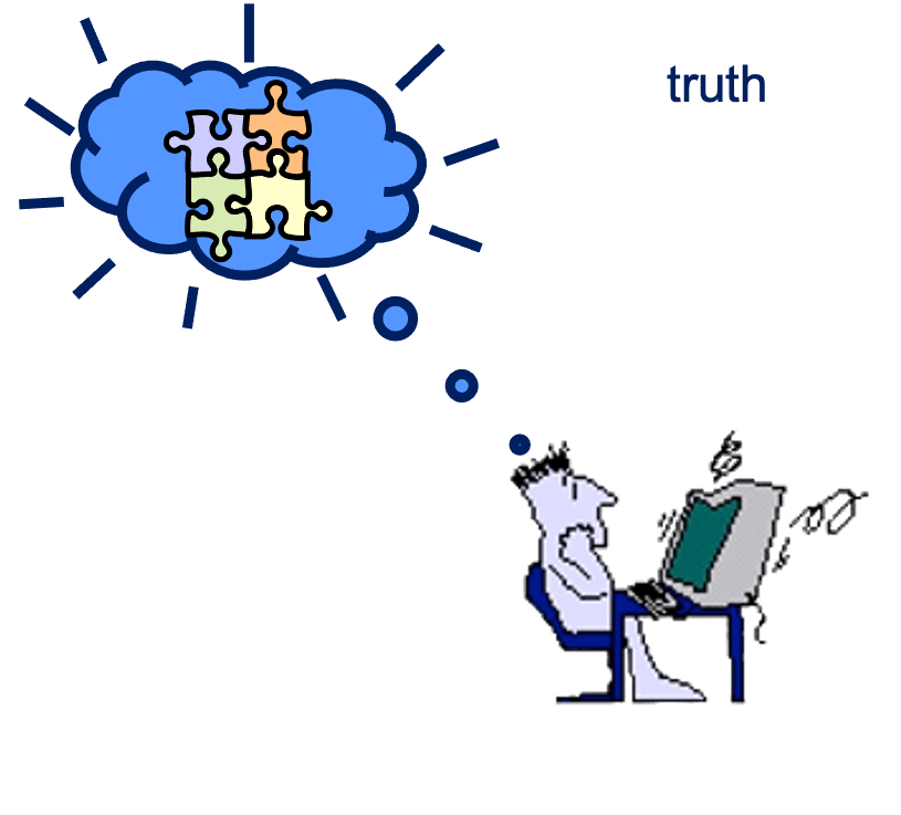 The combinations of the puzzle represent the train of thoughts - ideas. This process activates extraction, transformation, aggregation, validation, and verification techniques that are performed by Data Owners, Data Stewards and Data Advisors. All these mental and physical techniques reside in DQ as well, and they (trans)form an idea to a physical or mental unit, that can be re-used by further thoughts, as those of a data scientist. The data scientist finally creates a value through truth. Certainly, all actions become only facts when they are shared within regulated communities that follow agreed social rules.